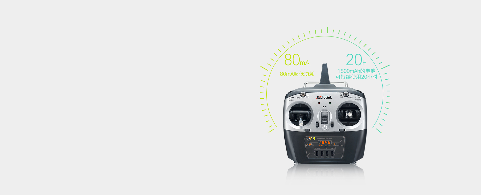 T8FB采用全新硬件设计,解决高效开关电源干扰的同时,实现80mA超低功耗,一节3S,1800mAh的电池可持续爽飞20小时!每一项指标都是高标准!