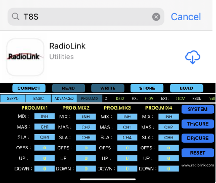 Search the APP in the Apple App Store and download by inputting T8S, T8FB or Radiolink.