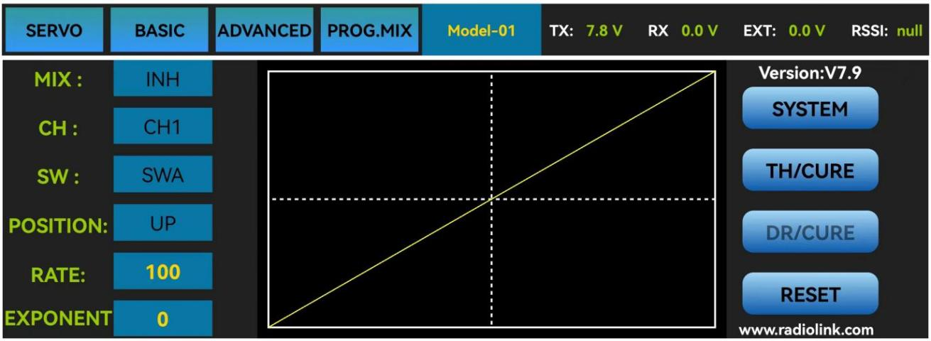 You can turn the “MIX” from “INH” to “ON”, and set master channel, slave channel. Set “UP” and “DOWN” to the same value. This value determines the servo travel range and movement direction of slave channel.