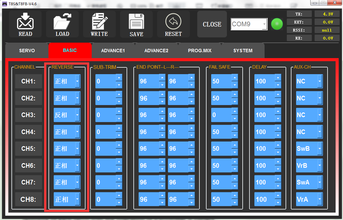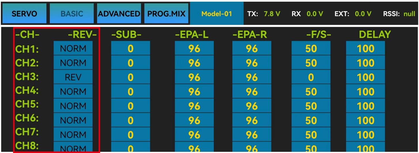 Note: The directions of the 4 channels can be easily changed by toggling the corresponding Reverse Switches instead of modifying the parameter data in the software/APP.