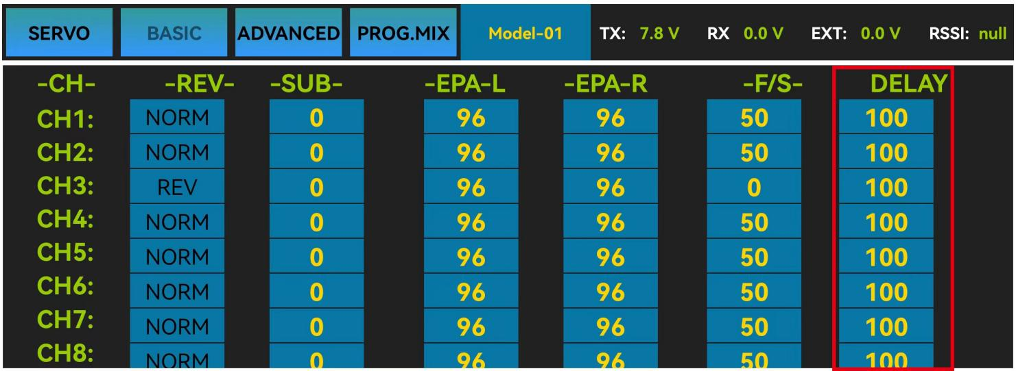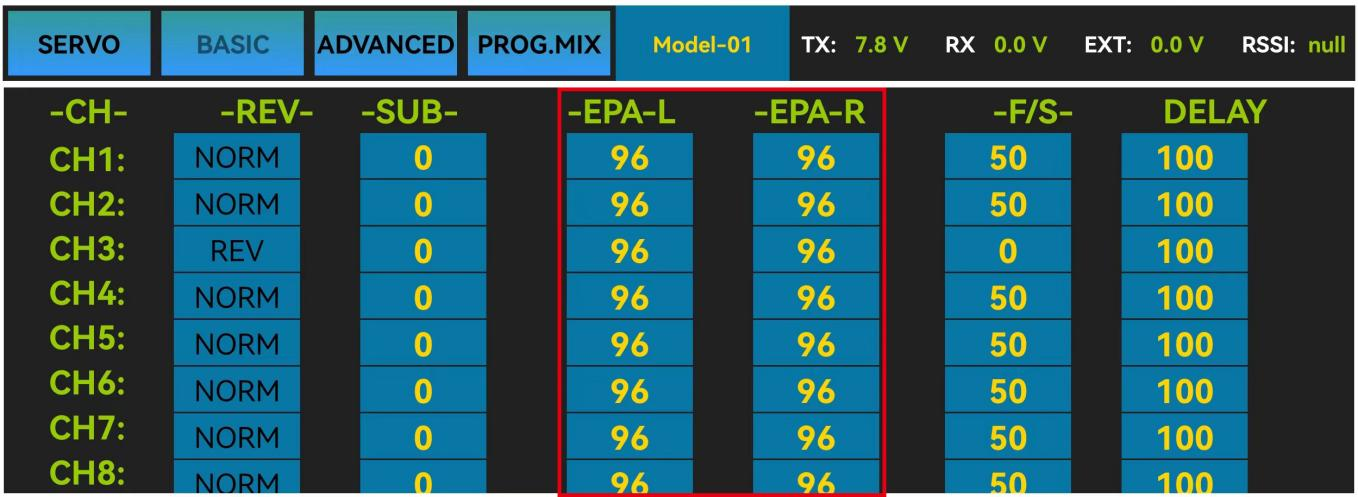 When setting the model or after the first flight, if you feel that the movement of the model is still relatively small when you move the joystick to the maximum position. You can increase the travel range percentage of the corresponding channel of the servo (the maximum can be adjusted to 120, The default is 96). EPA-L and EPA-R respectively represent the travel range on two sides of the neutral point. You can choose the side you want to modify to adjust travel range percentage.