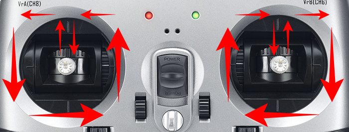 2) Range Calibration: Toggle both sticks (Ch1-4) to the highest point/maximum and the lowest point/minimum. Then back to the central point. (Refer to image below)
