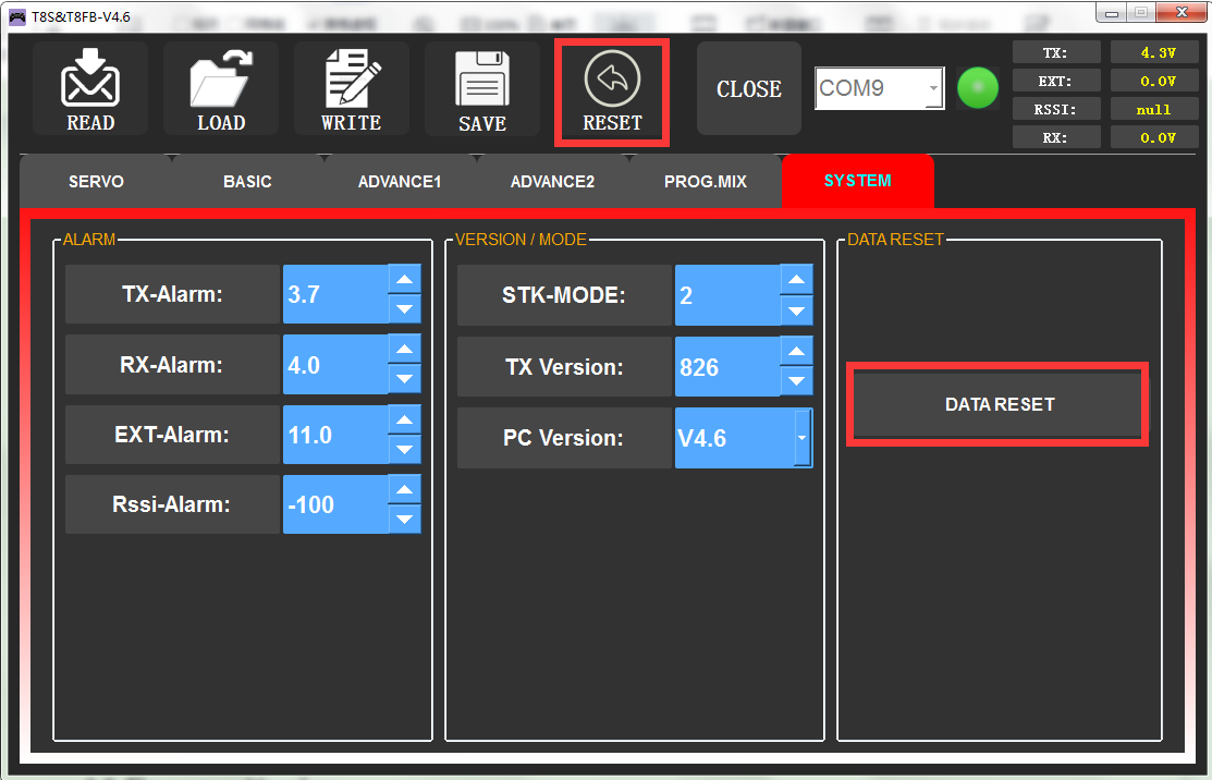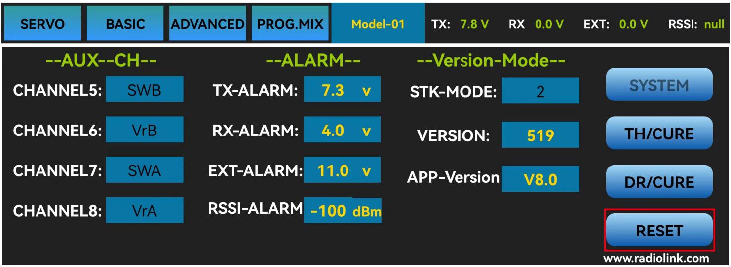 This function is to restore the factory setting when necessary. When press this “RESET” button, T8FB will make three slow D sounds, meaning default setting is set.