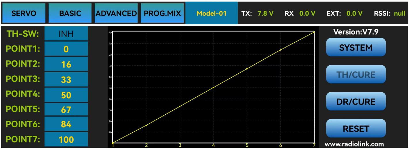 When “TH-SW” is set from “OFF” to “ON”, the throttle curve function is turned on. Adjust the value of 7 points. The adjustable range is from 0 to 100. The larger the value it is, the larger the output throttle is when the throttle joystick moves to the corresponding position.