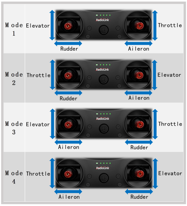 Mode 2: left joystick-Rudder and Throttle, right joystick-Aileron and Elevator