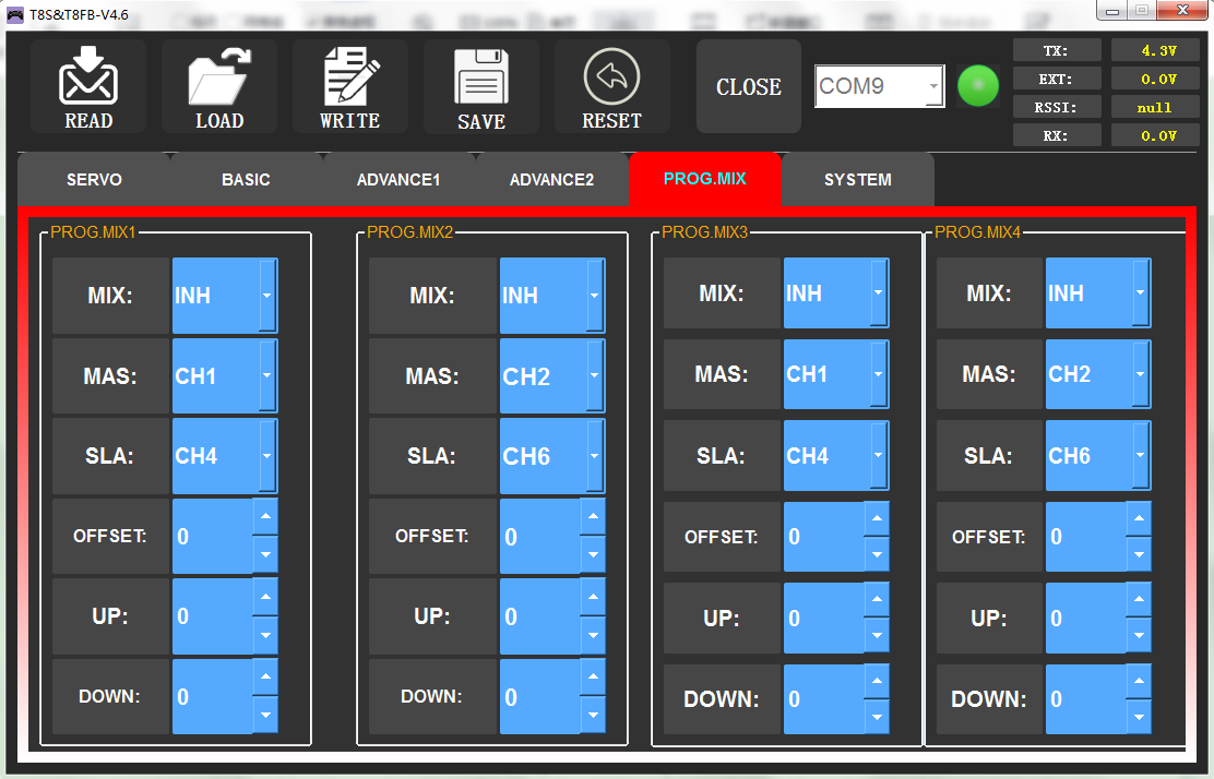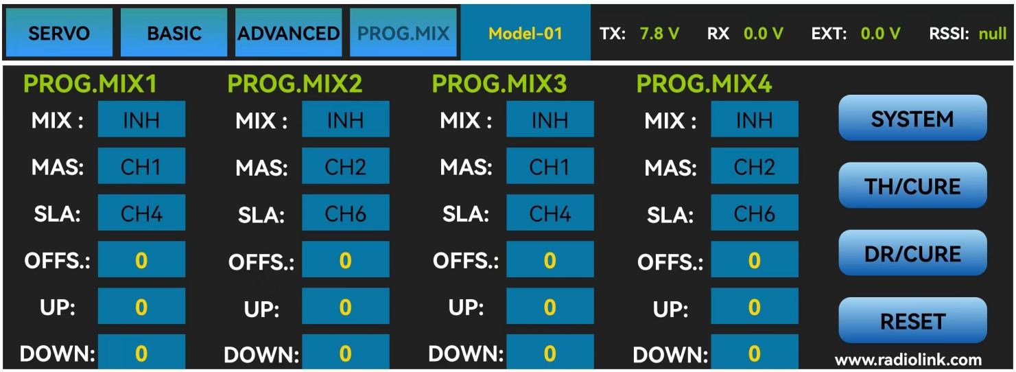 The setup menu includes: SERVO, BASIC, ADVANCE, PROG.MIX. After click PROG.MIX, there are 4 PROG.MIX setting, SYSTEM, TH/CURE, DR/CURE, RESET. For detailed setting method, please refer to 3.2 Basic Menu.