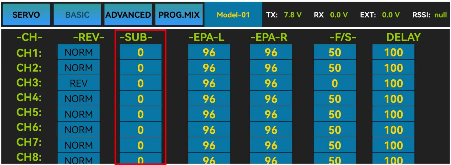 Makes small changes or corrections to the neutral position of each servo. The default is 0 setting by factory setting. That is, no SUB-TRIM. The range is from -100 to +100 and can be modified with actual need.