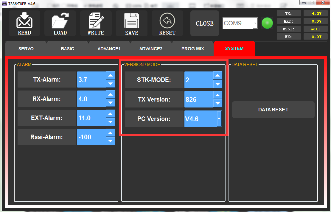 Note: Each interface can display the transmitter voltage, receiver voltage, RSSI value, and telemetry battery voltage (Telemetry function is available when using R8FG, R7FG, R8F, R8XM receivers ).