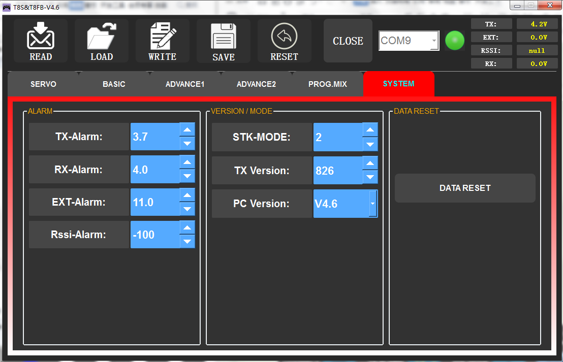 The default signal strength alarm value of the T8FB is -100dBm. You can set a reasonable value according to the actual situation to prevent the model from losing control due to weak signal. When the RSSI goes lower than value you set, T8FB will make ”DDDD” sounds as a unit to warn.