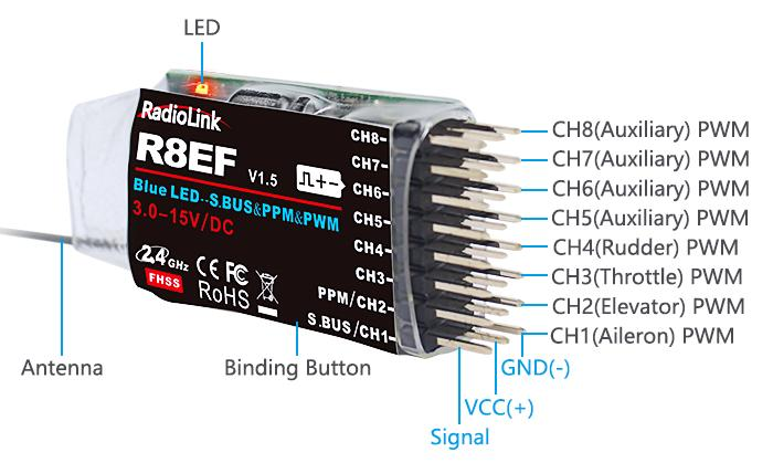 Receiver indicator is Blue(Purple) with 8 channels output in total. Channel 1 is SBUS signal, channel 2 PPM signal and channel 3 to 8 PWM signal.