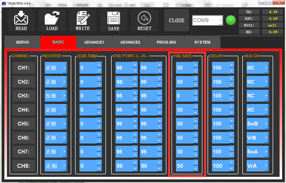 If the flight has reached the limit control distance, there is strong interference in the flight area, there are obstacles between the transmitter and the receiver, or T8FB low voltage it will cause loss of control. At this time, you can set the Fail-Safe, so that the model can maintain working at the F/S value you set after loss of control. F/S needs to be set in advance. Each channel can be set independently.