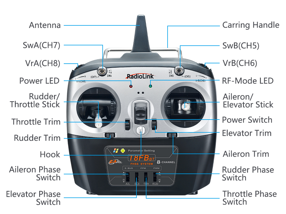 Switch A and Switch B: SWA (CH7) is two-way switch, and SWB (CH5) is three-way switch. which can be assigned to the auxiliary channel through APP to control the equipment connected to this channel. (Note: If you have purchased RadioLink RTF with a T8FB transmitter, the three-way switch SWB (CH5) controls the switching of the flight mode by default.)