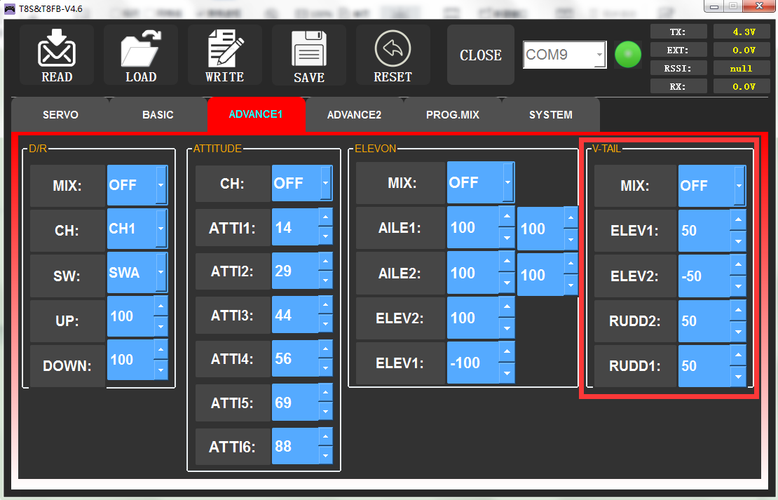 When setting one channel for different servo travel range, click “WRITE” after setting D/R value for the corresponding channel. When setting 4 channels for different servo travel range at the same time, click “WRITE” after setting D/R value for each channel. For example: after setting D/R value of channel 1, click “WRITE” to save the settings, and then switch the channel to “CH2”. Set D/R value of channel 2, and then click “WRITE” to save the settings. Repeat this step for channel 3 and channel 4.
