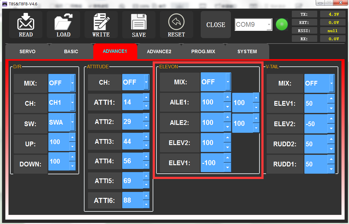 When “MIX” is set from “INH” to “ON”, the “ELEV “and “RUDD “function is turned on. When this function is turned on, then both CH2 and CH4 will respond, and servo travel range can be adjusted individually.