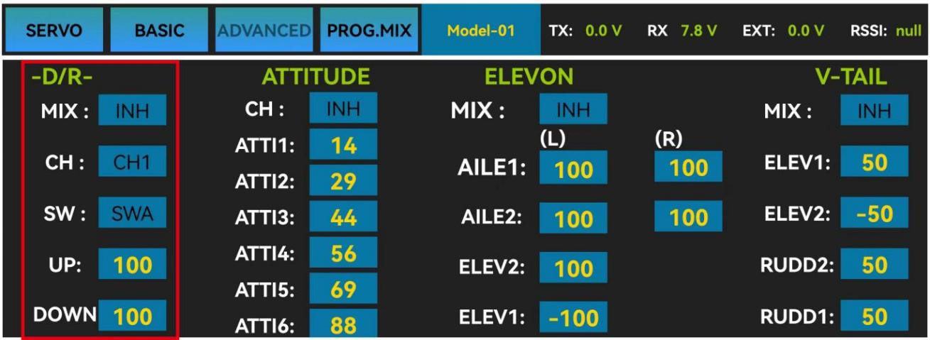 DR/CURE: It’s an index. When it is not set, the value defaults to 0, and the output servo travel range of the corresponding channel will be output in proportion to the move of the joystick. The value can be set from -100% to +100%. The change of the index will not change the maximum and minimum servo travel range. When controlling the aircraft, the index setting value is usually negative.