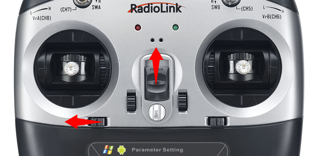 1) When the transmitter is power-off, toggle both sticks at the central point. Press rudder trimmer left and turn on transmitter at the same time, red and green LED will start flashing and the T8FB is ready to be calibrated.