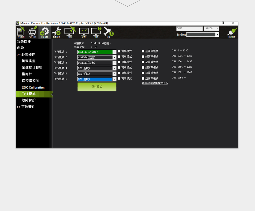 默认PIX飞控6段飞行模式设置,即便初入门模友在不参考说明书及教程视频的情况下亦能轻松设置。