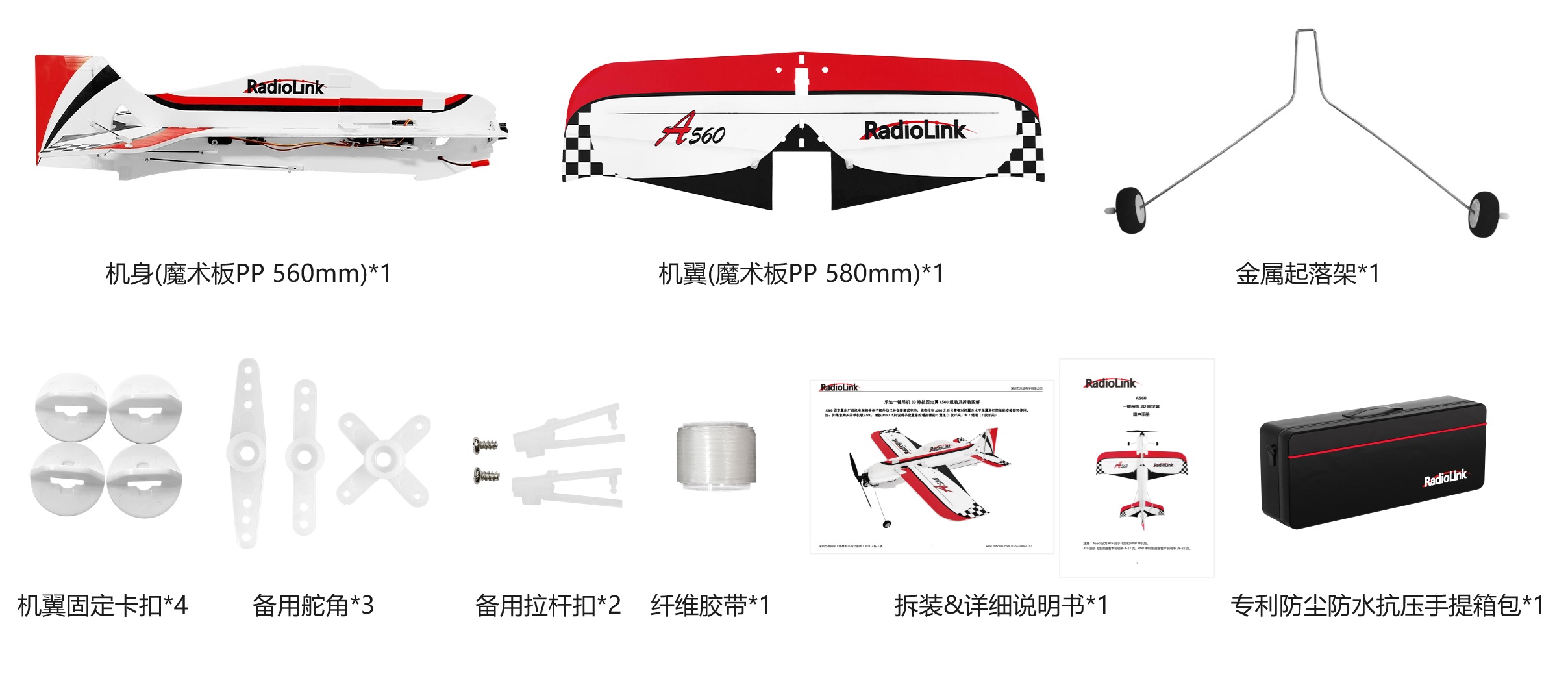 备注: ① 换新的新款A560机身套装包含:机身(魔术板PP),机翼(魔术板PP),水平尾翼(魔术板PP),副翼舵机,升降舵机,方向舵机,电机固定座,尾翼支撑杆,舵机拉杆(均已完成安装),机翼&尾翼固定卡扣,金属起落架,纤维胶带,拆装说明书,专利防尘,防泡水,抗压手提箱包。 ② 换新的新款A560机身套装不包含:电机+桨叶固件圈,电调,飞控,桨叶,电池,接收机。如果您的旧款A560这些电子件均能正常使用,可拆下装在新版A560机身上,如果有缺失的,可以在换新时按下文中标注的配件优惠价购买更换。 | ||||