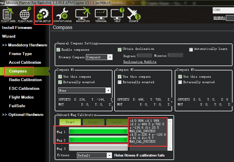 Connect Mission Planner to AutoPilot, and then connect receiver to AutoPilot to finish the calibration of transmitter, Accelerometer and compass.