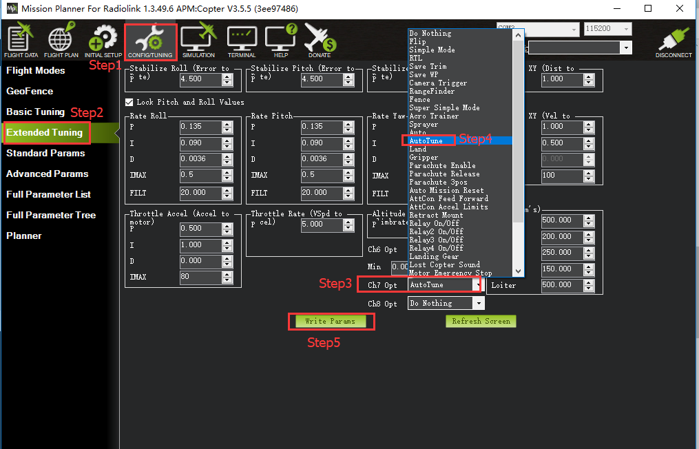 AutoTune attempts to automatically tune the Stabilize P, Rate P and D, and maximum rotational accelerations to provide the highest response without significant overshoot. Copter needs to be “basically” flyable in before attempting to use AutoTune as the feature needs to be able to “twitch” the copter in the roll and pitch axis.