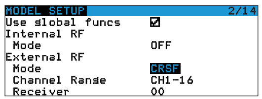 In OpenTX system, enter into MODEL SELECTION--MODEL SETUP. Turn off the "Internal RF". E enable"External RF" and select "CRSF" as the protocol, as shown below: