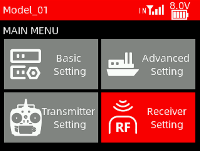 When T16D transmitter is used, mount the module on T16D. Enter Receiver Setting -> RF Protocol. Set the module to External, and select the corresponding protocol and baud rate, as shown below: