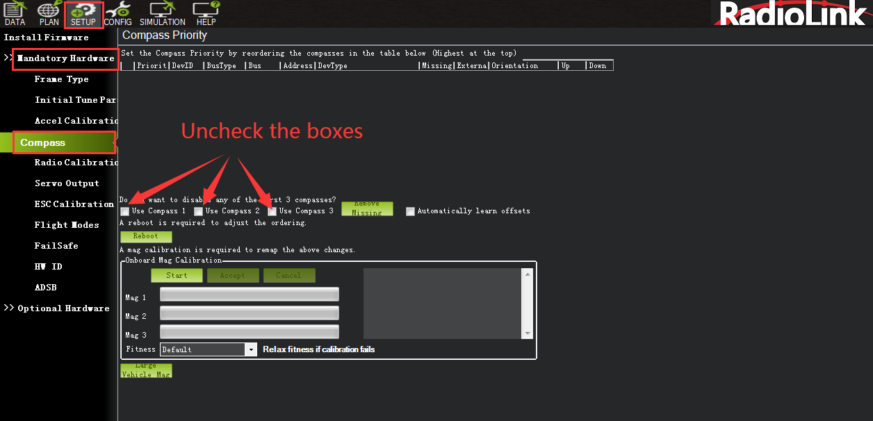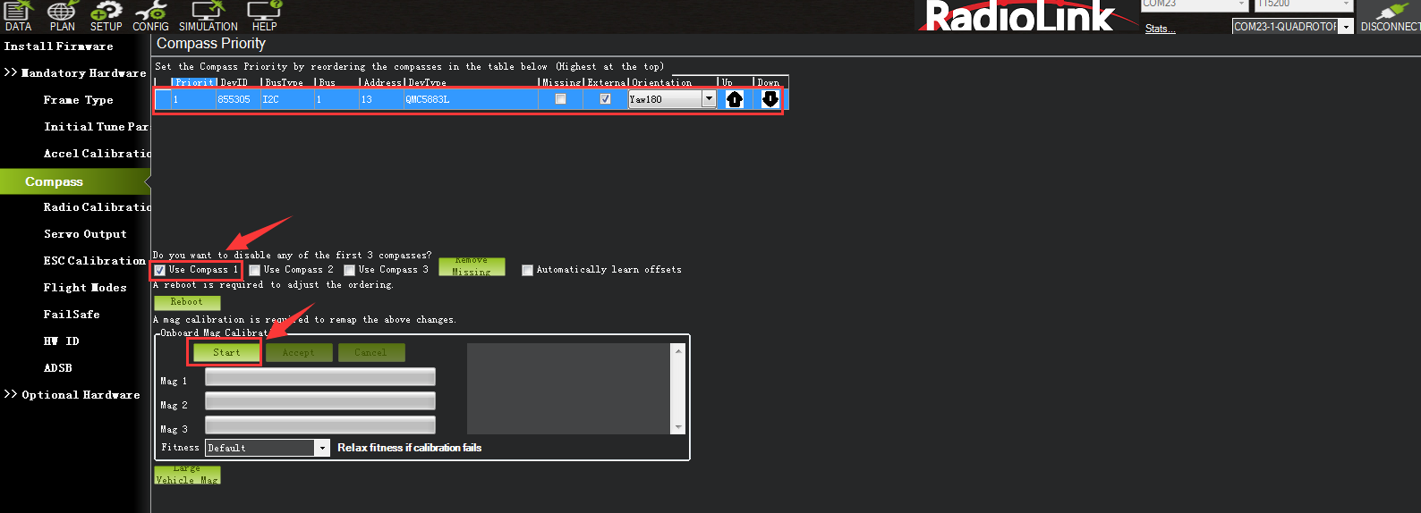 Please fixed CrossRace Pro and TS100, then click “Start” and turn CrossRace Pro and TS100 till the progress bar of Mag 1 to the end and there will be a prompt: Please reboot the autopilot. Click OK and then reconnect CrossRace Pro to computer, compass calibrate success after restart the CrossRace Pro.
