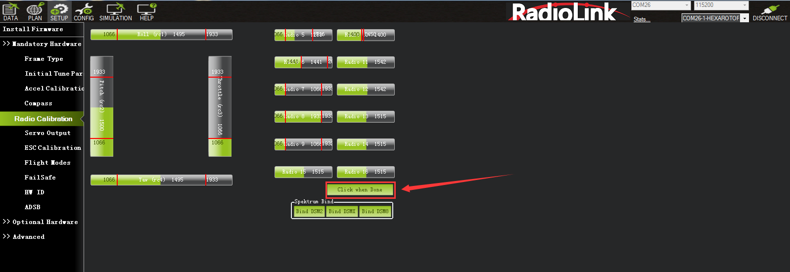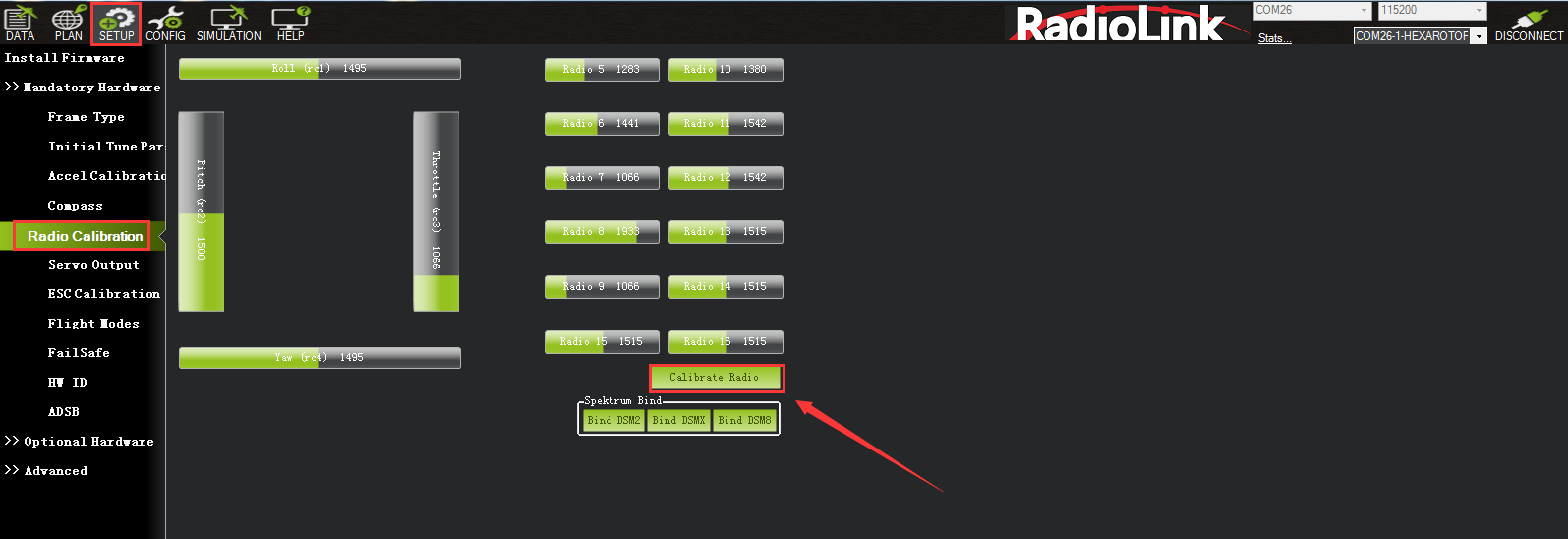You need to connect the receiver first and then you can calibrate the radio. For details on receiver connection, please refer to Chapter 5.2.3.