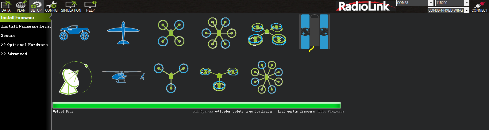After it prompts Upload Done, you can click CONNECT in the upper right corner to connect your CrossRace Pro to Mission Planner and set it.