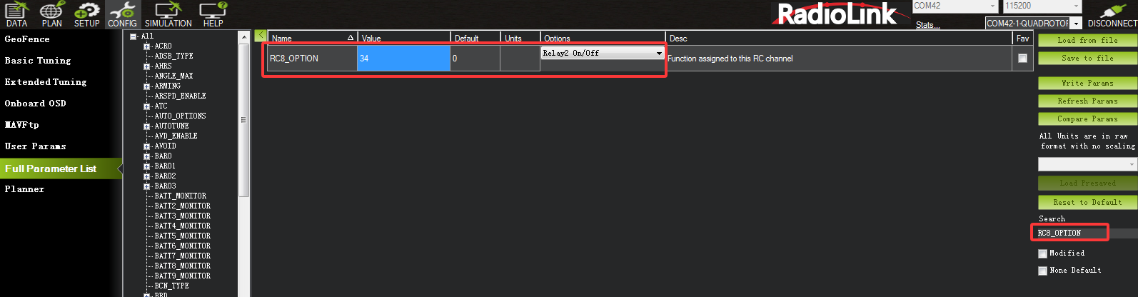 The 12V output of CrossRace Pro is turned on by default. If you want a switch to control the 12V output, you can select a channel, such as channel 8. Search for RC8_OPTION in the Full Parameters List, and change it to relay 2 ON/OFF (34). After writing parameters and restarting the flight controller, you can control the 12V on and off through channel 8.