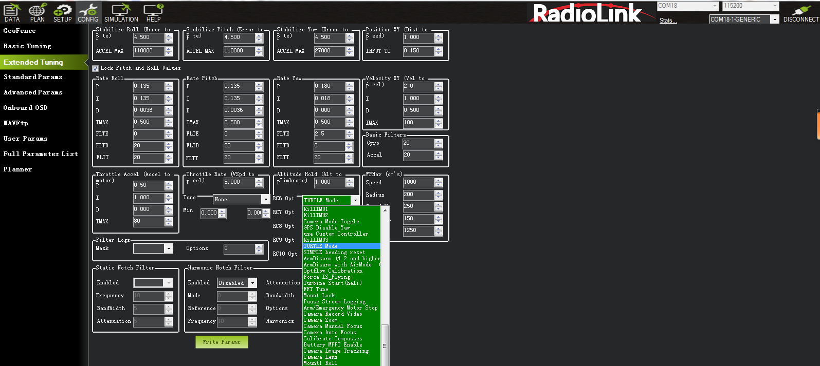All settings of the flight controller can be set or adjusted. You can enter Full Parameter List to search the parameter you want to modify and then modify it. After the modification, please remember to click Write Params on the right.