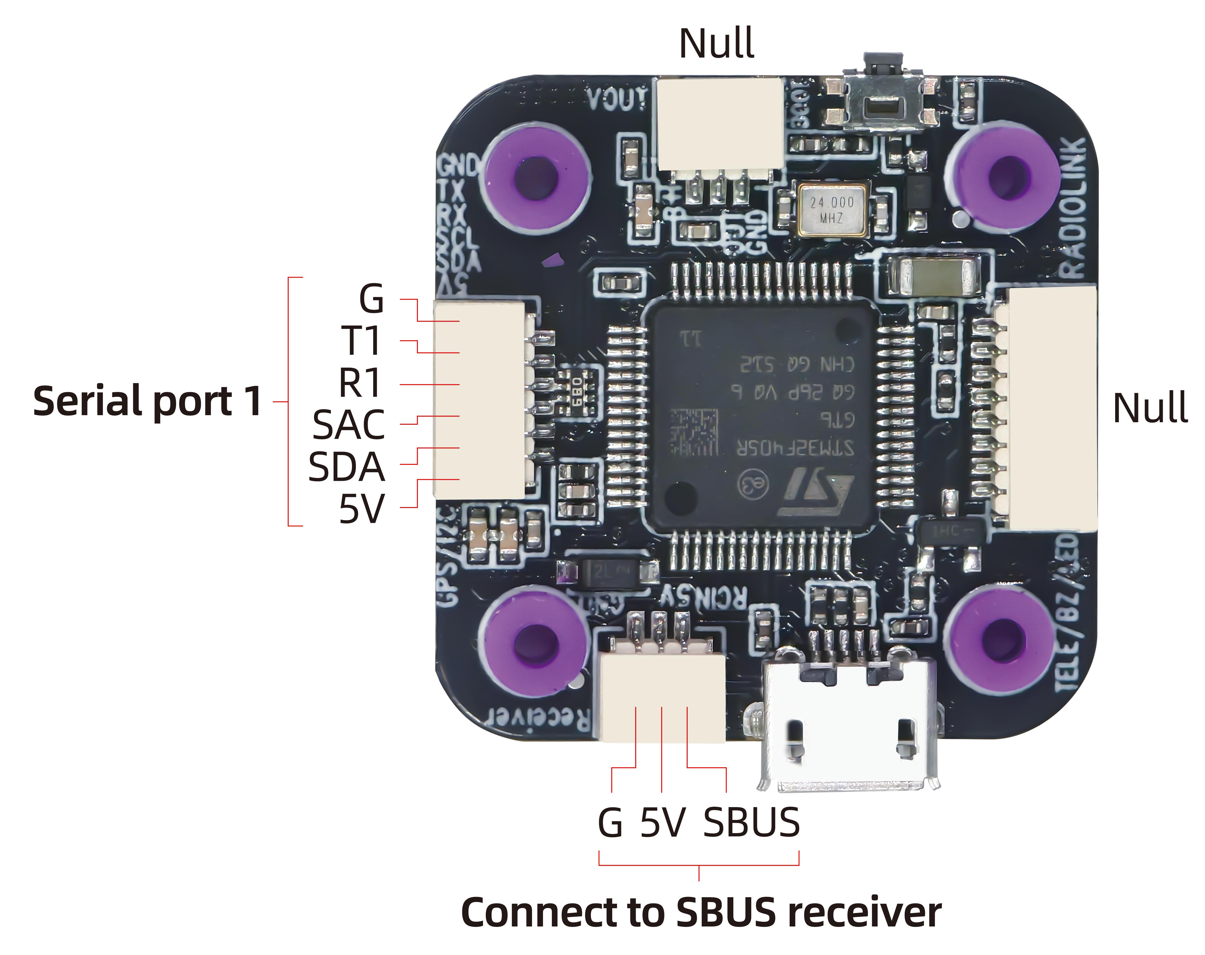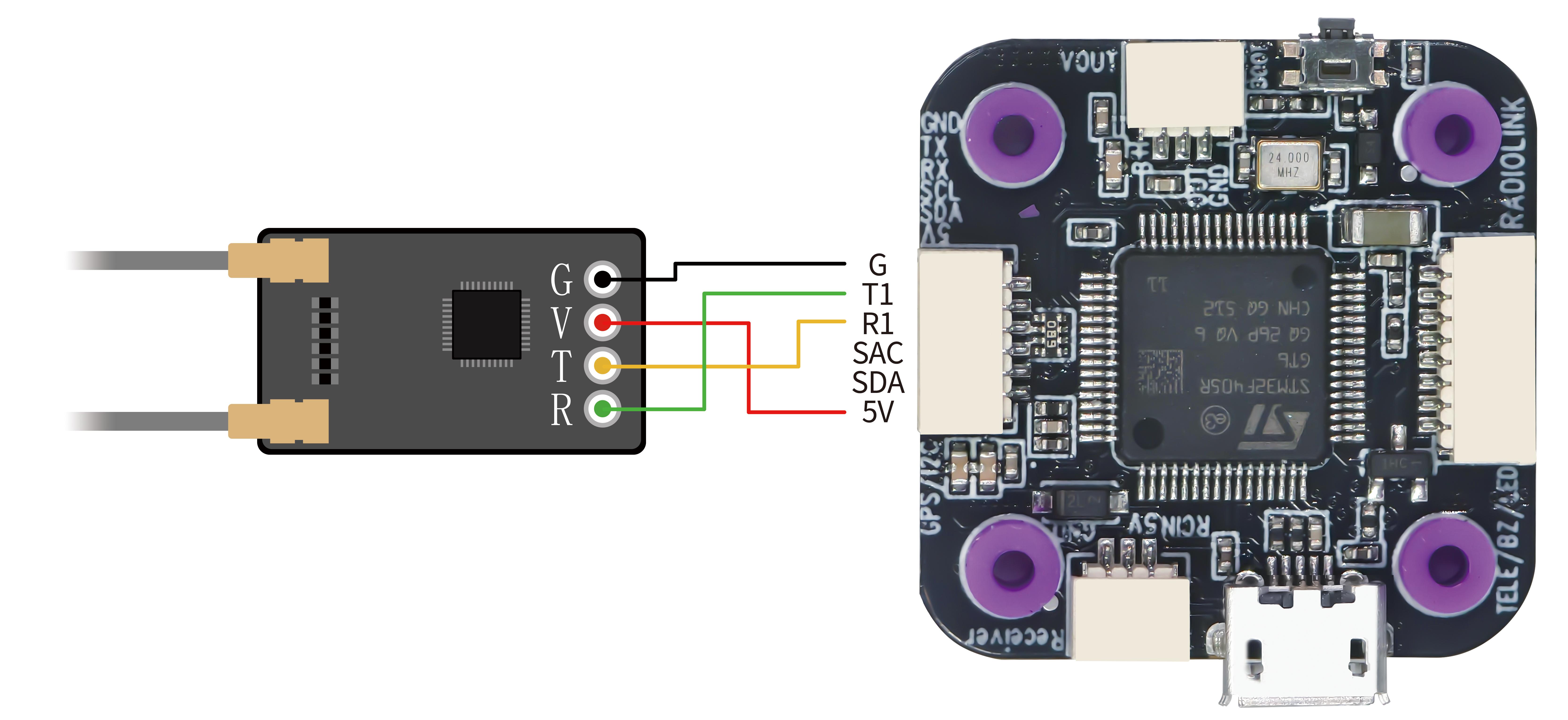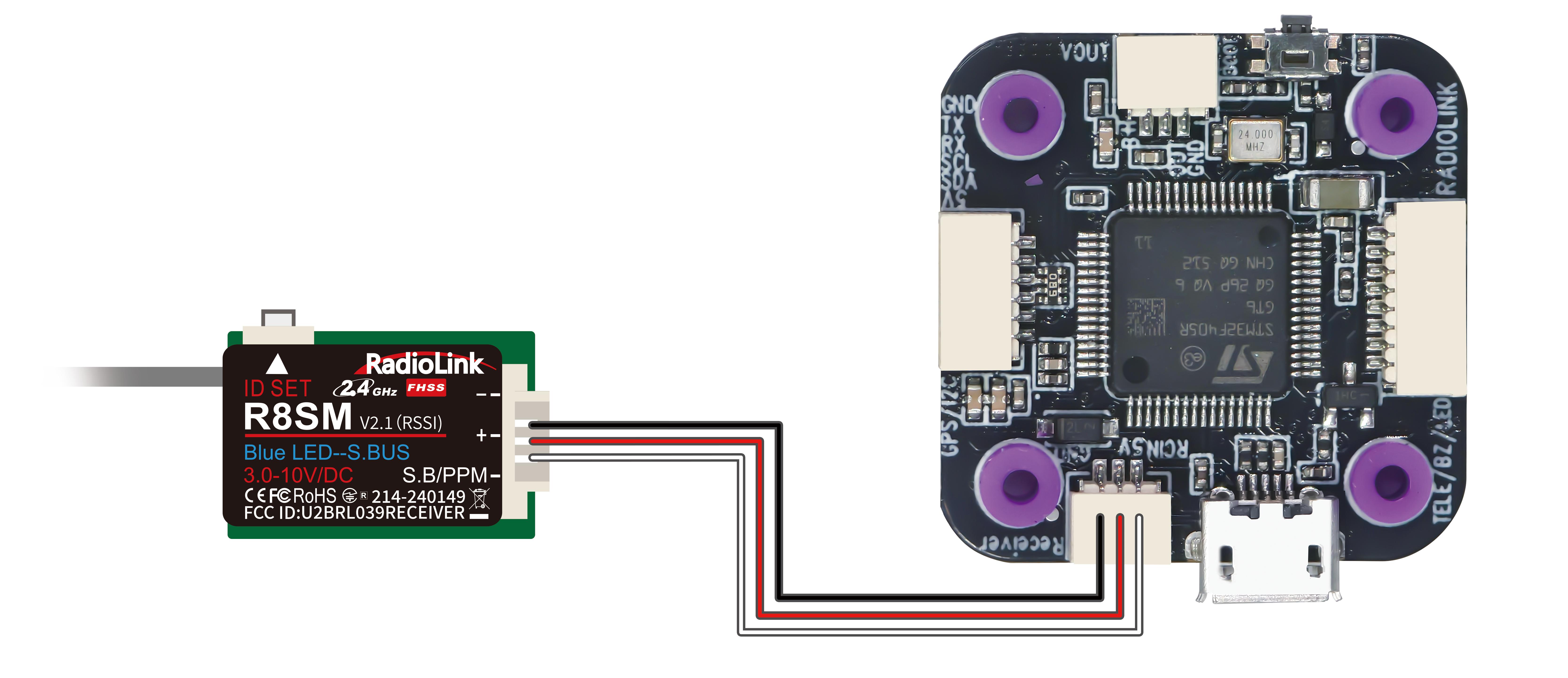If SBUS receiver is used with LDZ-B20, please connect SBUS receiver to the SBUS receiver connect port of the flight controller (As shown below. RadioLink R8SM receiver is used as an example). Since the factory configured receiver serial port is serial port 1 (for ELRS receiver), you need to modify the settings when using the SBUS receiver, otherwise there will be conflict between the SBUS serial port and the ELRS receiver serial port, resulting in the failure of the communication between the transmitter and receiver.