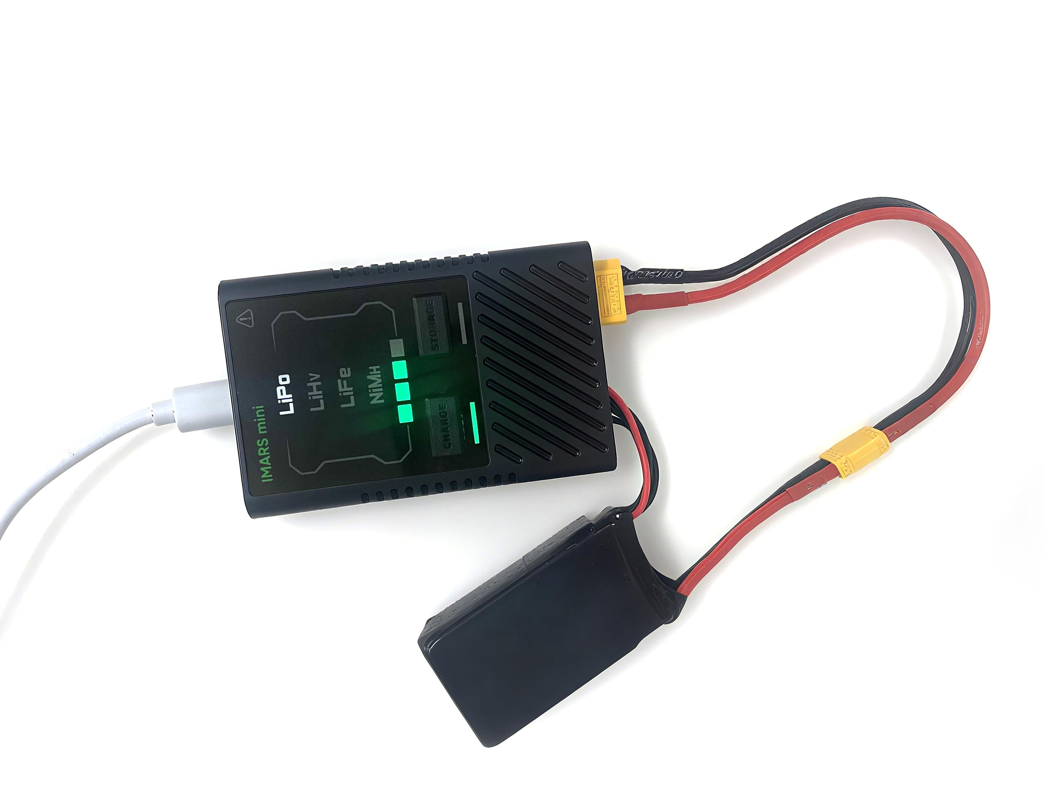 When connecting a non-smart battery, under the condition that the discharge connector and the balance connector are successfully connected, if you need to enter the charging mode, firstly short press any key to select the battery type, for lithium batteries, then you need to press and hold the CHARGE button for 2 seconds, but for NiMH batteries, you need to simultaneously press and hold the CHARGE and STORAGE buttons for 2 seconds to start the charging mode. After successfully entering the charging mode, the charger will beep, and the charging indicator light will lash at a frequency of 1Hz. The charger does not need to set the charging current. The charger will intelligently adjust the charging current to a suitable charging current according to the battery voltage fluctuation. During the charging process, the battery capacity indicator light will display the current real-time battery status. The charger will beep when the battery is fully charged, and the charging indicator light will remain on.