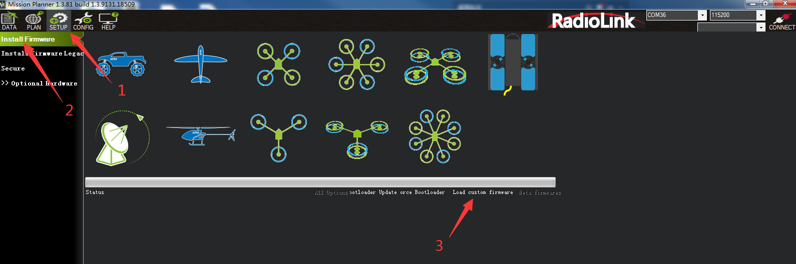 Connects the flight controller to Mission Planner via the TYPE_C data cable. Select the COM port. Click SETUP--Install Firmware--Load custom firmware. Please select the apj firmware. After there is a prompt below, unplug the flight controller, click OK, and then plug back in. Then wait for the firmware update. The steps are shown below.