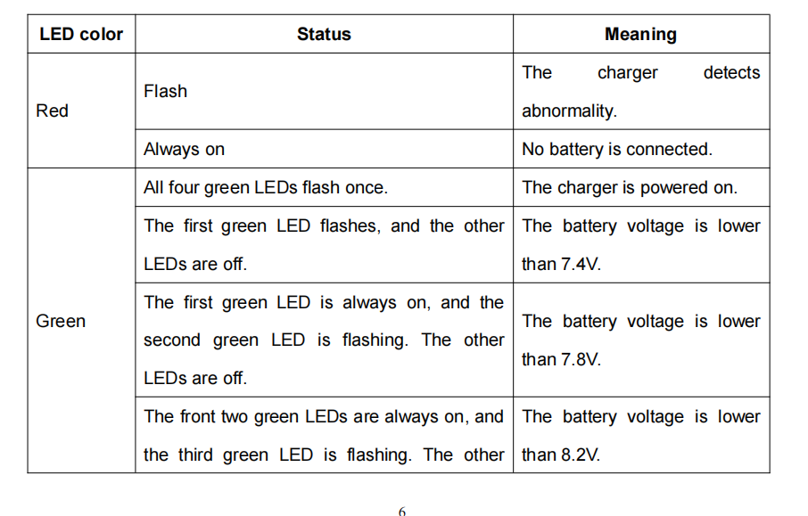 When all four LED indicators turn solid green, the battery is fully charged, and the charger will automatically stop charging.