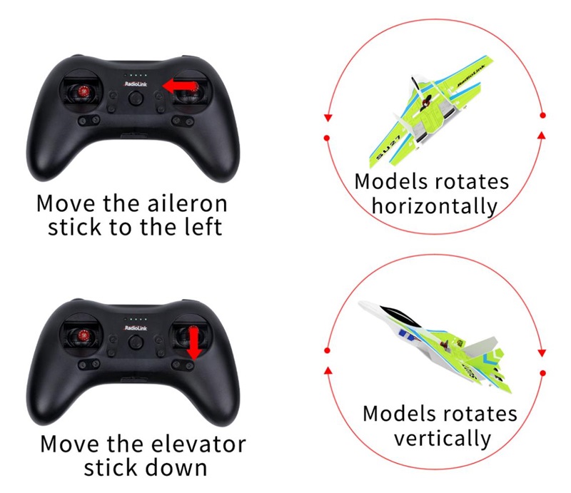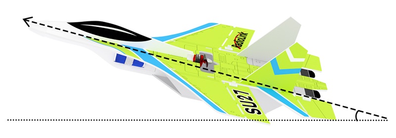 The model attitude (inclination angles) is controlled by joysticks. When the joystick is back to a central point, the aircraft will level. The max inclination angle is 70° for rolling while that for pitching is 45°.
