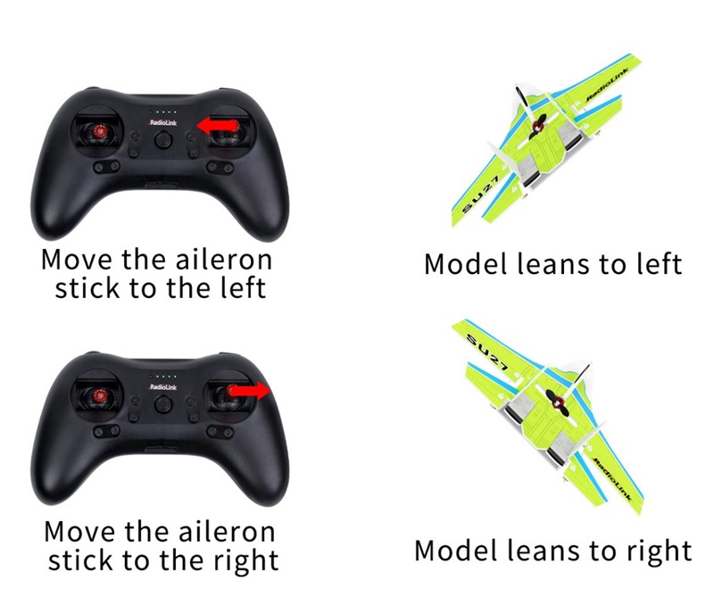 Move the aileron stick to the left, and the movement direction of the ailerons and tailerons is reversed | Aileron mix control reversed | Short press the button once | Green LED of CH1 on/off |