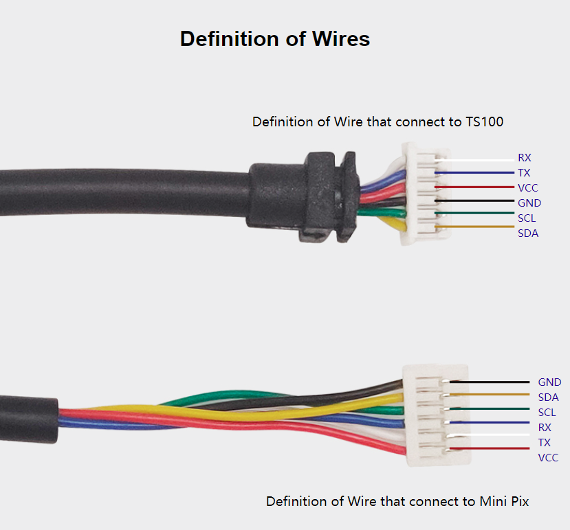 GPS Mainboard: White wire-RX, Blue wire-TX, Red wire-VCC, Black wire-GND, Green wire-SCL, Yellow wire-SDA