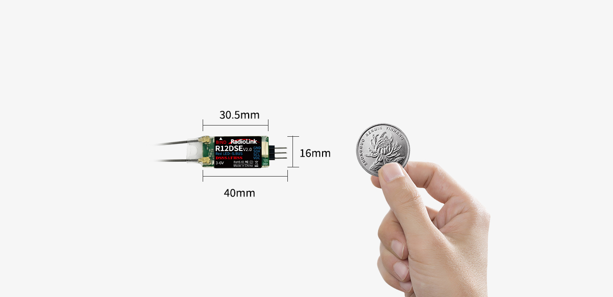R12DSE, with a super-lightweight of 2.5g and a small size of 30.5*16mm,