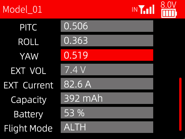 In addition to real-time transmission of the RSSI value and model battery voltage, the OSD information such as latitude, longitude, speed, heading, the number of GPS satellites received, distance, PITC, ROLL, YAW, battery voltage, current, capacity, flight mode will be displayed on the transmitter screen when the R16SM is connected to the flight control and GPS.