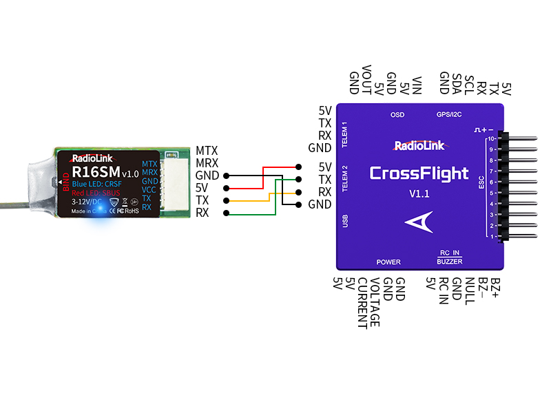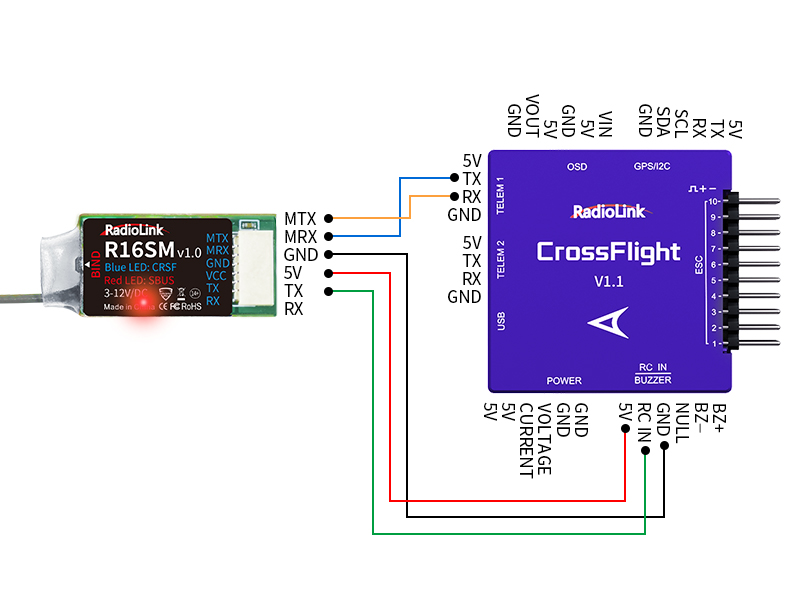 CRSF signal working mode: When the blue LED of the R16SM is always on, the receiver is connected or welded to the TELEM1/TELEM2 port of the flight controller.