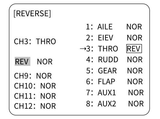 Steps: Long press Mode to enter BASIC MENU - rotate Dial to REVERSE - Press Push to enter the menu - rotate Dial to 3:THRO - change NOR to REV - Long press Push for 1 second to confirm.