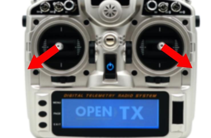 (2) Push the left stick (left and down) and the right stick (right and down) as below and hold more than 3 seconds. The green LED flashes once mean the calibration completed. It is also normal for the control surface to swing or the motor to rotate once at this time.