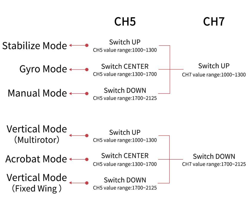 There are six flight modes: Stabilize Mode, Gyro Mode, Manual Mode, Acrobat Mode, Vertical Mode(Multirotor), and Vertical Mode(Fixed Wing). Flight modes are switched by CH5(3-way switch) and CH7(2-way switch) by default. The value range of channel 5 and channel 7 corresponding to the flight mode is as shown below: