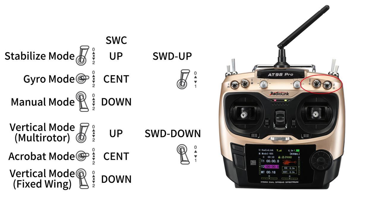 Take RadioLink AT9S Pro transmitter as example. Flight modes are set by CH5(3-way switch SWC) and CH7(2-way switch SWD) as below.