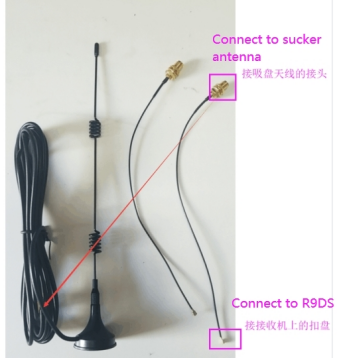 The antenna connector of R12DS/R9DS receiver is IPEX. Make sure the sucker antenna has the IPEX connector. Please refer to the picture below: