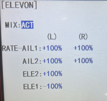 Note: Do not set ELEVON when the aircraft is equipped with a flight controller, because the mixing in the transmitter will conflict with the mixing in the flight controller. Please refer to the manual of the to flight controller view the setting method.