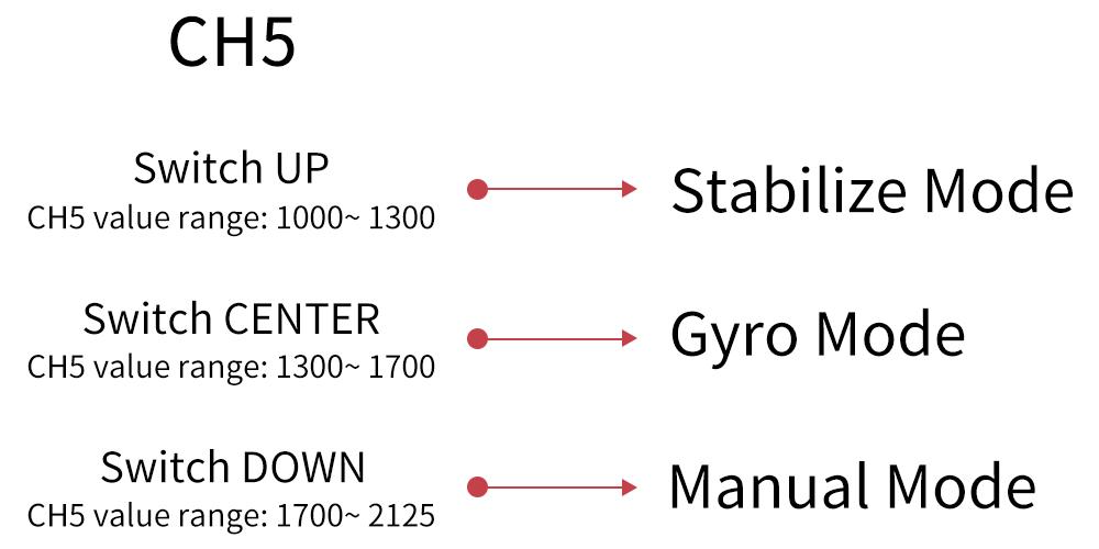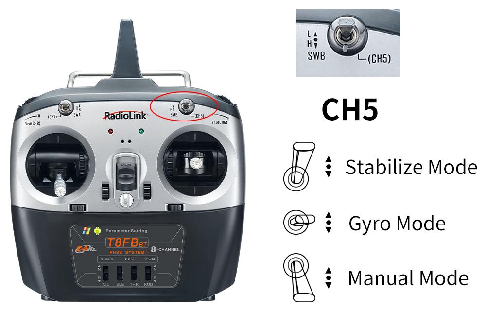 Flight modes can be set channel 5 (CH5) (a 3 way switch) in the transmitter with 3 modes: Stabilize Mode, Gyro Mode and Manual Mode. Take RadioLink T8FB/T8S transmitters as examples: