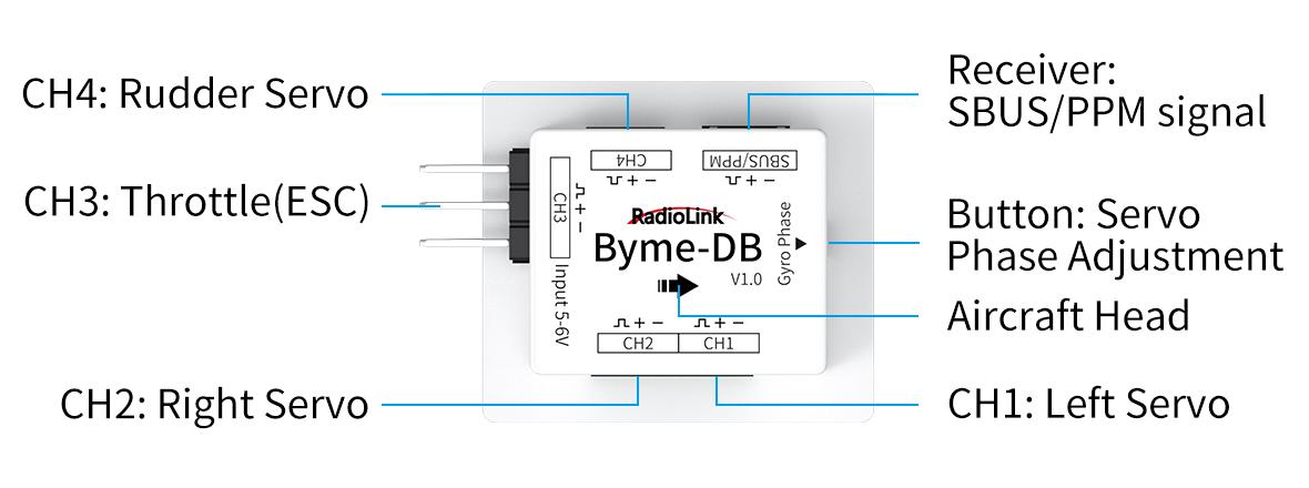 Make sure the arrow on Byme-DB points to the aircraft head. Use 3M glue to flatly attach Byme-DB to the fuselage. It is recommended to install it near the center of gravity of the aircraft. Byme-DB comes with a receiver connect cable which is used to connect the receiver to Byme-DB. When connecting the servo cable and ESC cable to Byme-DB, please check whether the servo cable and ESC cable match the sockets/head of Byme-DB. If they do not match, the user needs to modify the servo cable and ESC cable, and then connect the cables to Byme-DB.