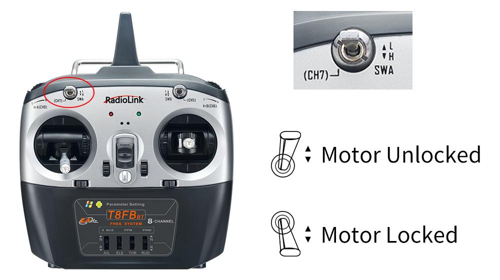 The motor can be locked/unlocked by Channel 7 (CH7) in the transmitter.